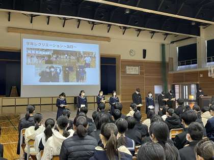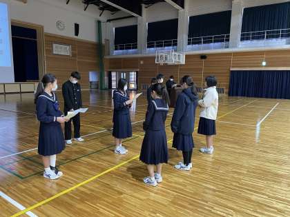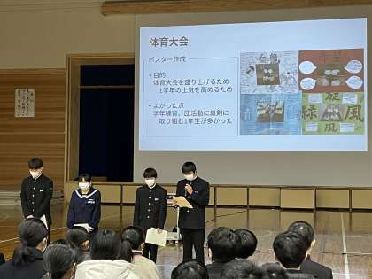 学年生徒会から2学期の振り返りがあり、生徒は真剣に話を聞いていました。体育大会や合唱コンクール、定期考査や普段の生活を振り返り、3学期に向けての課題が明確になりました。