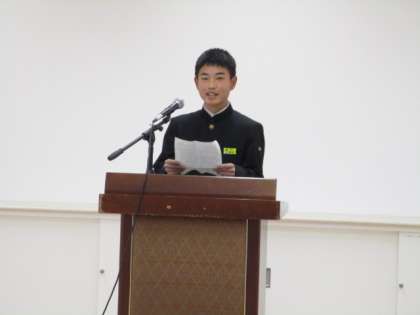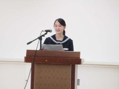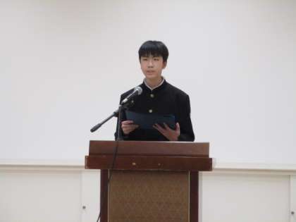 受賞報告会の後、各学年の代表者が意見発表を行いました。今学期行った学年生徒会や部活動、合唱コンクール等の活動を通してんだことやこれからの目標が述べられました。