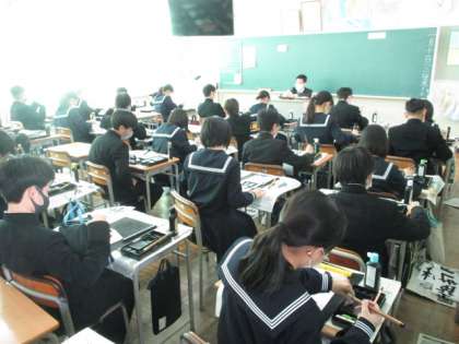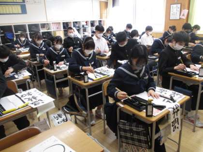 3限は書初大会でした。1年生は「世界平和」、2年生は「白梅の春」、3年生は「温故知新」と書きました。写真は上から16H、24H、39Hの様子です。