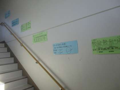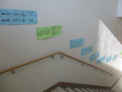 3年生が通る2階から4階にかけての階段の壁には公式や要点などをまとめた掲示物が数多く貼られています。しっかり身に付けて役立てたいですね。