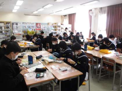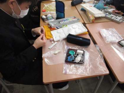 2限、28Hの美術の様子です。粘土と絵の具を使って和菓子づくりをしています。本物の和菓子そっくりに仕上がります。