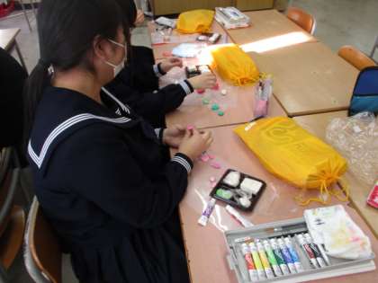 2限、28Hの美術の様子です。粘土と絵の具を使って和菓子づくりをしています。本物の和菓子そっくりに仕上がります。