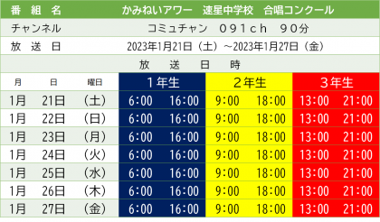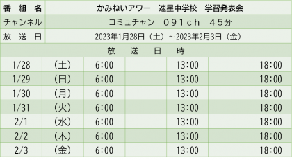 10月に開催しました「合唱コンクール」及び「学習発表会」について、上婦負ケーブルテレビから放映日時の連絡がありましたので、お知らせします。
