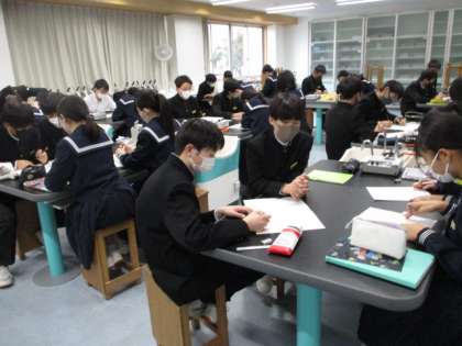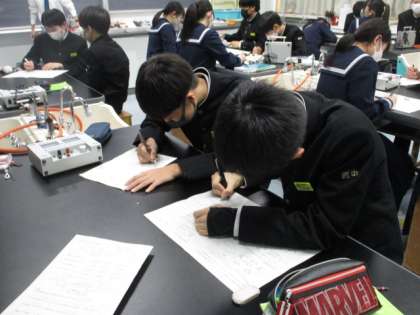 2限、22Hの理科です。並列回路を流れる電流の大きさを測定する実験の授業でした。実験は終わって結果をワークシートにまとめています。