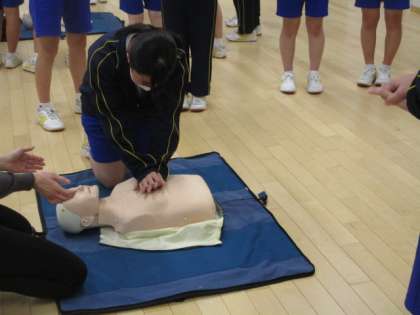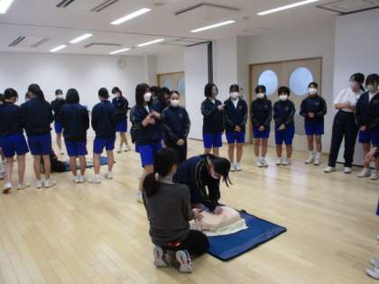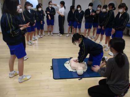 3限の24H、25Hの女子の保健体育の様子です。会議室で心肺蘇生法を学びました。人型の模型を使って一人一人が心肺蘇生を体験しました。