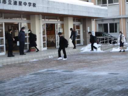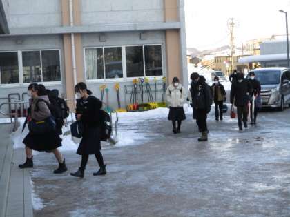 今朝は登校時、晴れてきました。道路の雪は少し減ってきたようです。本日の下校完了時間は17:30です。