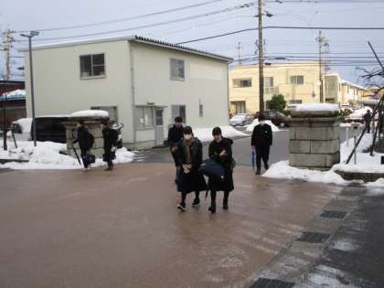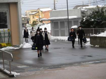 今朝は登校時、時々雪が降りました。今日は3年生の多くは私立高校一般入試を受検し、1,2年生は確認テストを行います。本日の下校完了時間は16:00です。