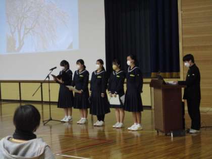 生徒会執行部による速星中学校の特徴につての説明の様子です。4月に児童の皆さんが速星中学校に入学されることを、心待ちにしています。