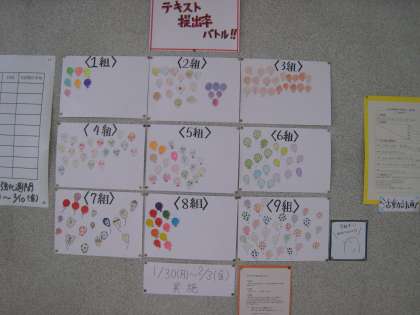 学年生徒会主催の「テキスト提出率バトル」も今日で最終日でした。各クラス、テキスト学習をがんばっています。