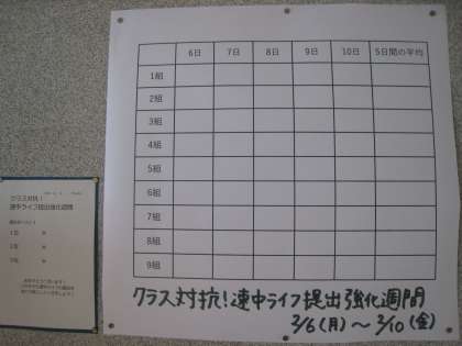 来週からは「クラス対抗!速中ライフ提出強化週間」が始まります。来週もがんばります。