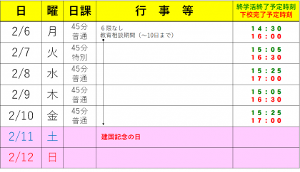 2/6(月)〜2/12(日)までの予定は、以下の通りです。