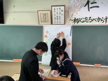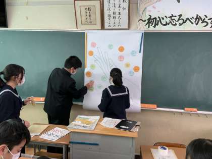 シャボン玉の形をした記述用紙に、金曜に考えた仕事に必要な力と、その力を付けていくためにどのように中学校生活を過ごしていきたいかを書きました。そして、各クラス1枚の模造紙にそれぞれのシャボン玉を貼り付けました。それぞれの思いが乗った9枚の模造紙は、全学年が見られる2F中央廊下に掲示する予定です。