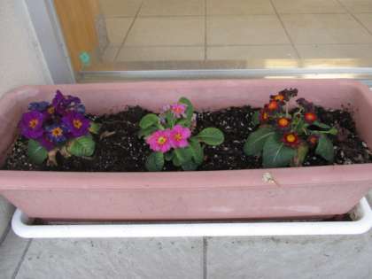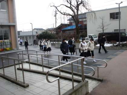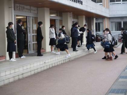 今朝は登校時、曇りになりました。玄関前のプランターのいくつかは寒さに負けず花を咲かせています。本日の下校完了時間は17:00です。