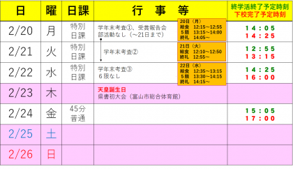 2/20(月)〜2/26(日)までの予定は、以下の通りです。