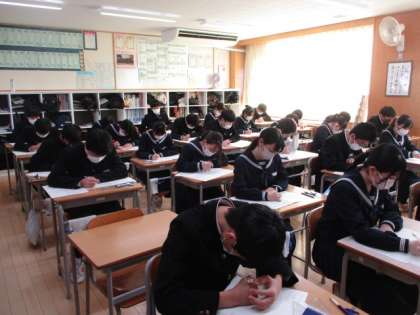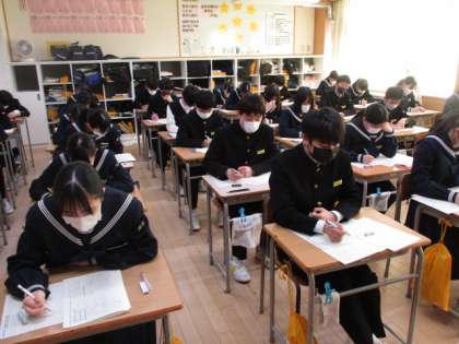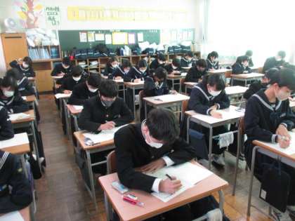 今日から学年末考査が始まりました。写真は2限の様子です。1年生が数学、2年生が国語、3年生が数学のテストに取り組んでいます。