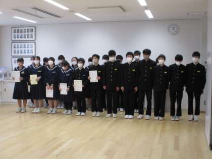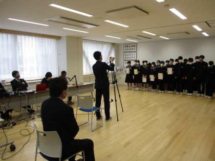 午後、会議室からのリモート配信で受賞報告会を行いました。文化部や運動部の受賞をはじめ、多くの受賞者の報告がありました。