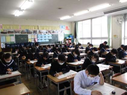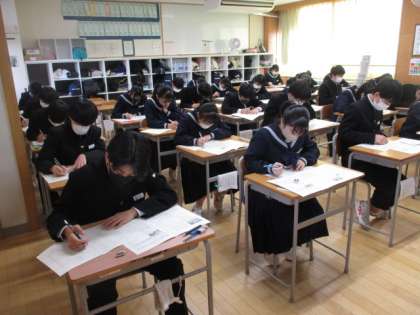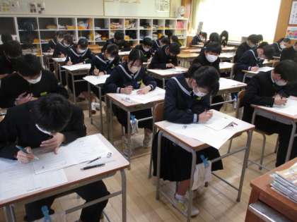 今日は学年末考査2日目です。写真は2限の様子です。1年生が美術、2年生が英語、3年生が社会に取り組んでいます。