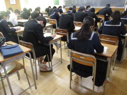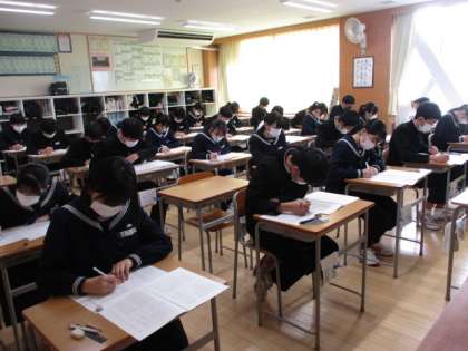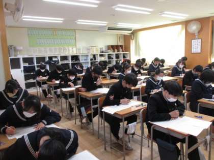 3年生は今日、中学校生活最後のテストとなる「確認テスト」を受けました。2限、国語の様子です。来週は県立高校一般受検です。体調に気を付けて最後まで頑張ってほしいと思います。