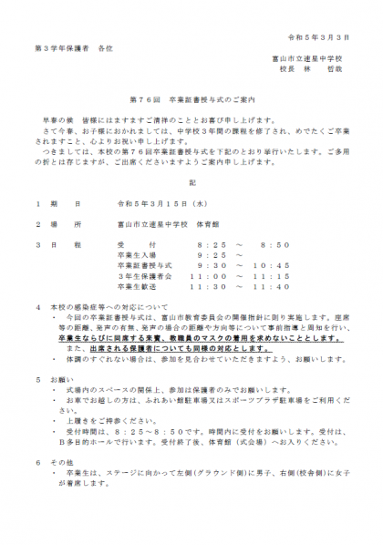 令和5年3月15日(水)に挙行いたします『第76回卒業証書授与式』の案内を、本日、3年生生徒に配布します。