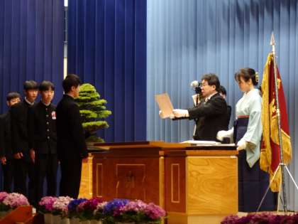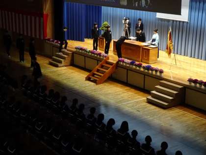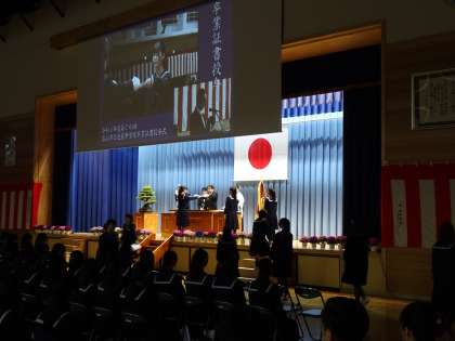 卒業証書授与の様子です。厳粛な中で行われました。スクリーンには証書を受け取る一人一人の顔が映し出されました。