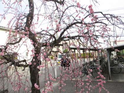 今朝の登校時は曇りになりました。今日から1、2年生のみの登校になります。玄関前のしだれ梅がきれいに咲いています。本日の下校完了時間は16:30です。