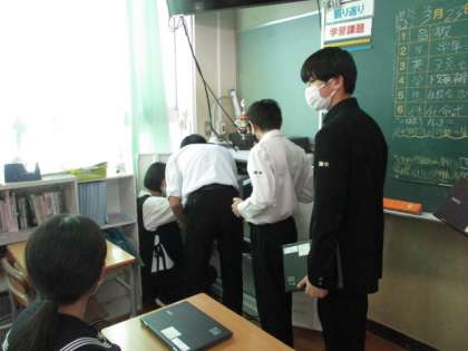 5限、2年生が3年生の教室のタブレットパソコンを1年生の教室に移動する作業を行いました。卒業生が使っていたタブレットパソコンは新入生が使うことになります。
