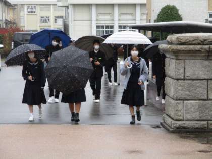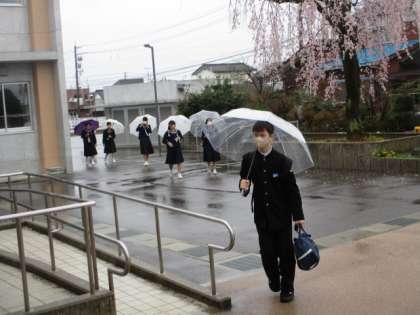 今朝の登校時は雨になりました。今日は令和4年度の修了式を行います。本日の下校完了時間は12:15です。
