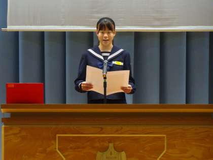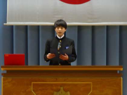 受賞報告会の後、各学年の代表者が意見発表を行いました。リーダーという立場や部活動の取組から学んだことやこれからの抱負を述べました。