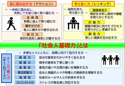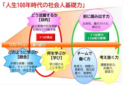 社会人基礎力…「前に踏み出す力」、「考え抜く力」、「チームで働く力」の3つの能力(12の能力要素)から構成されており、「職場や地域社会で多様な人々と仕事をしていくために必要な基礎的な力」として、経済産業省が2006年に提唱。「人生100年時代」や「第四次産業革命」の下で、2006年に発表した「社会人基礎力」はむしろその重要性を増しており、有効ですが、「人生100年時代」ならではの切り口・視点が必要となった。