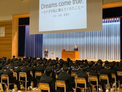 志を高める集会では、水馬さんが2学年代表として、春休み中に行ったカナダへのホームステイを経験をもとに、写真を交えて話をしてくれました。