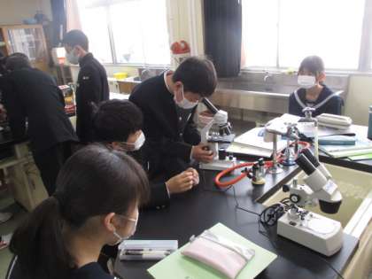2限、14Hの様子です。顕微鏡の使い方を学んでいます。プレパラート上の様々な物質を興味深く観察していました。
