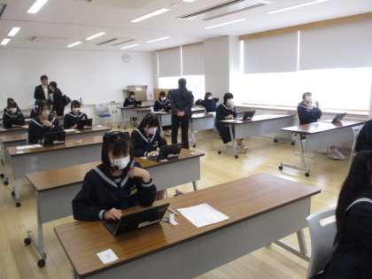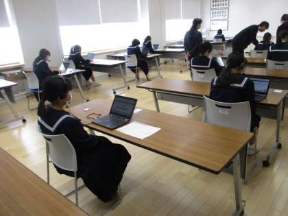 3年生は全国学力学習状況調査の英語の「話すこと」に取り組みました。場所は会議室です。1クラスの男子、女子ごとに入室して行いました。タブレットパソコンから出題される問題に英語で答えています。