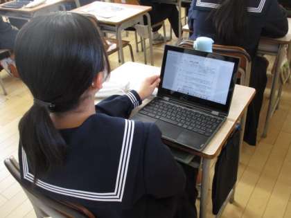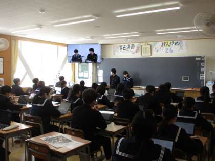 質疑応答は各教室のタブレットパソコンを用いて行われました。採決では過半数の生徒が賛成し、前期生徒会活動計画案は承認されました。