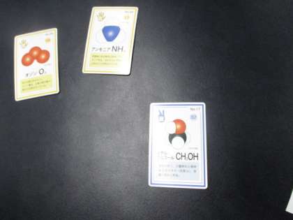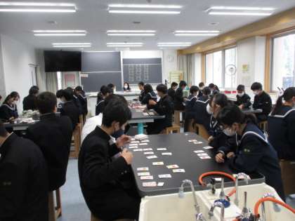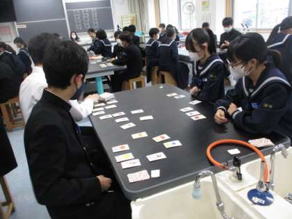 2限25Hの理科の授業の様子です。化学物質を示したカードを、かるたのように先生が読み上げるヒントで取り合っていました。