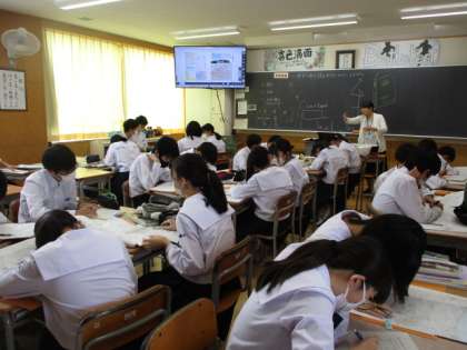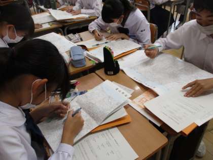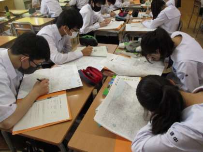 2限、21H社会の様子です。地形図を使って、距離や方位の読み取りを行っていました。