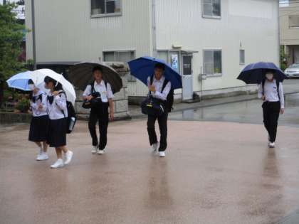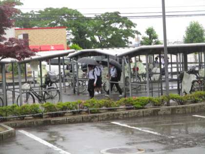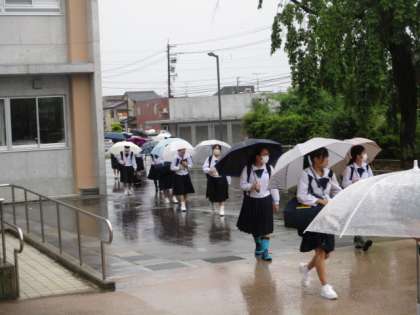 今朝の登校時は雨になりました。今日は1日雨が続きそうです。本日の下校完了時間は17:30です。