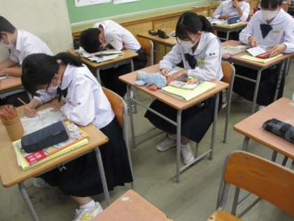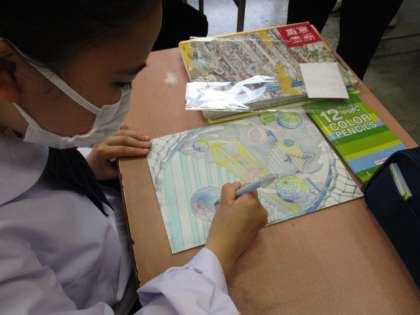 3限、38Hの美術の様子です。各自が創造した不思議な世界を絵で表現しています。