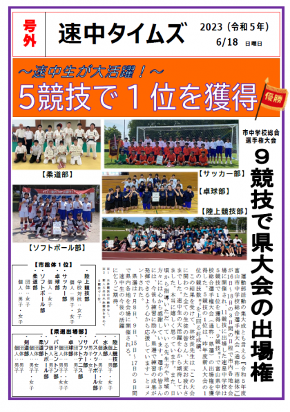令和5年度富山市中学校総合選手権大会での運動部の活躍を「速中タイムズ『号外版』」として発行しました。