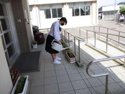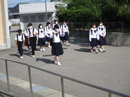 今朝の登校時は晴れになりました。今日は午後から2年生の多くの生徒が「14歳の挑戦」でお世話になる事業所に事前訪問に行く予定です。本日の下刻完了時間は16:15です。