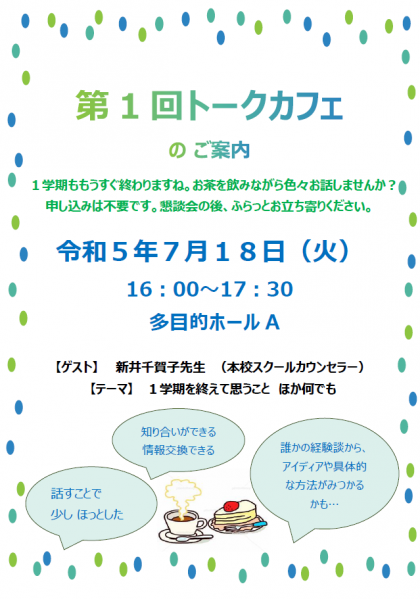 学校や家庭における生徒自身、または親子に関する様々なテーマを設け、ざっくばらんに語り合う機会としたいと考えています。