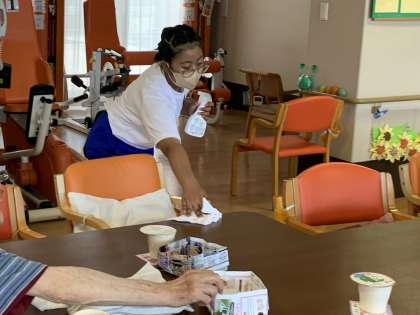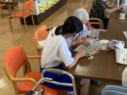 ちゅらさん婦中デイサービスでは、利用者さんとパズルをしたり、ドライヤーで髪を乾かしたり、様々なお手伝いをしていました。
