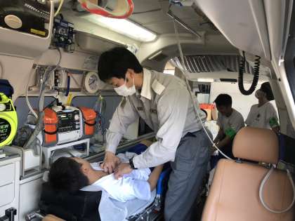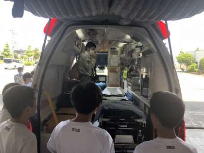 婦中消防署では、救急車の設備や救急隊の活動について説明を受けています。
