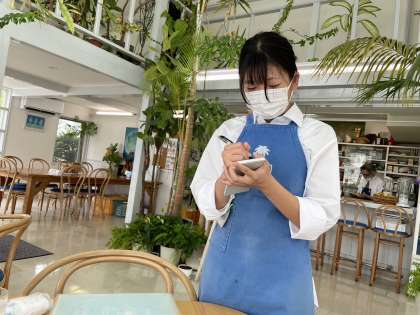 ココナッツアイランドでの活動の様子です。注文を取り、華やかなパフェを慎重に運んでいます。