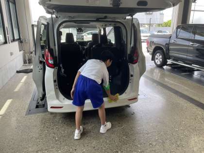 ネッツトヨタ婦中店の活動の様子です。車をタオルで拭き、車の中の埃や砂を機械で吸い取っていました。