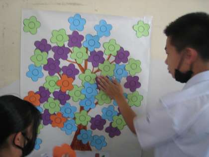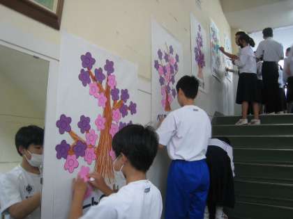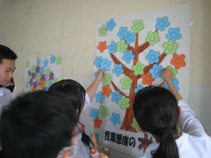 1学年生徒会では、6月から三週間、授業に対する取り組み方をチェックする「凡事徹底ライフ」という活動を行っていました。今日はその結果を掲示しました。各項目について、○のついた数の分、花が咲きます。