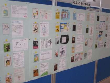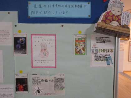 現在、生徒会の掲示コーナーに図書委員会が作成した「先生のおすすめの本」が掲示されています。先生が読んでおすすめの本を図書委員が楽しいポップがつけて紹介しています。読書する本を選ぶ参考にしましょう。