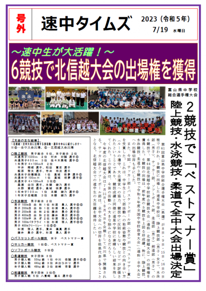 第61回富山県中学校総合選手権大会(通称:県選)での運動部の活躍を「速中タイムズ『号外版』」として発行しました。
