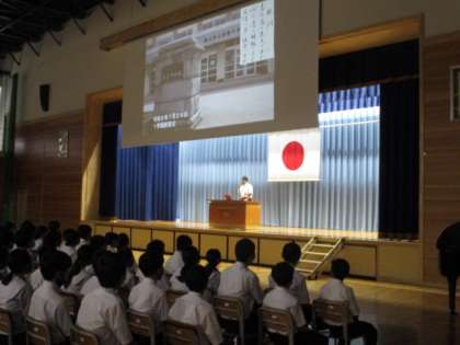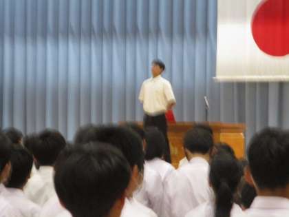 終業式は全校生徒が体育館に集まって行いました。校訓唱和の後、校長先生の式辞がありました。式辞では1学期を振り返りながら、活動の一つ一つには様々な「言葉」があること、そして「言葉」は人間にとってとても大切であること等を話されました。