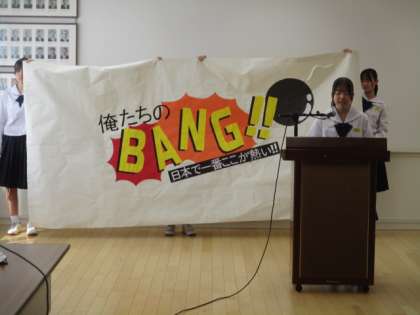意見発表会の後、体育大会実行委員から今年度の体育大会のスローガンが発表され、そこに込められた意味が説明されました。
