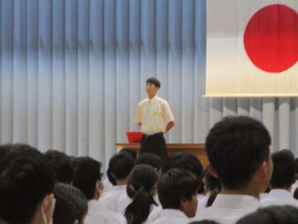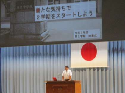 2限は全校生徒が体育館に集まって始業式を行いました。校訓唱和の後、校長先生の式辞がありました。式辞では「感謝の言葉」「創造的な言葉」「自分の言葉」という3つの言葉について解説され、それらを大切に過ごしてほしいとを話されました。